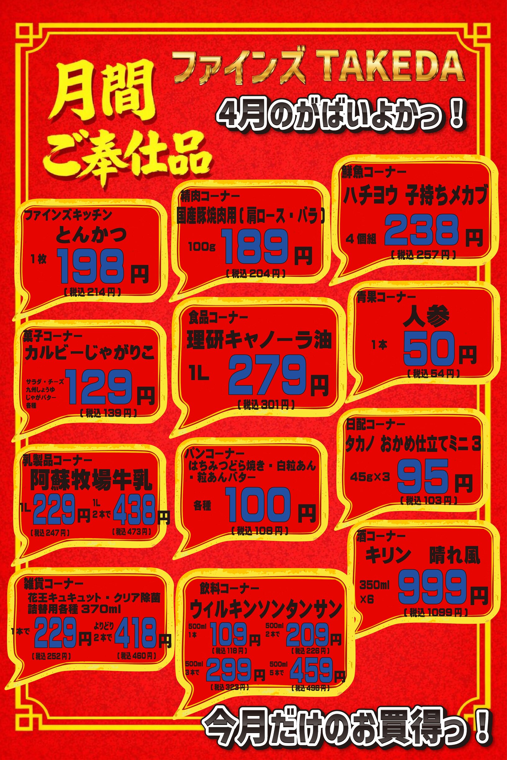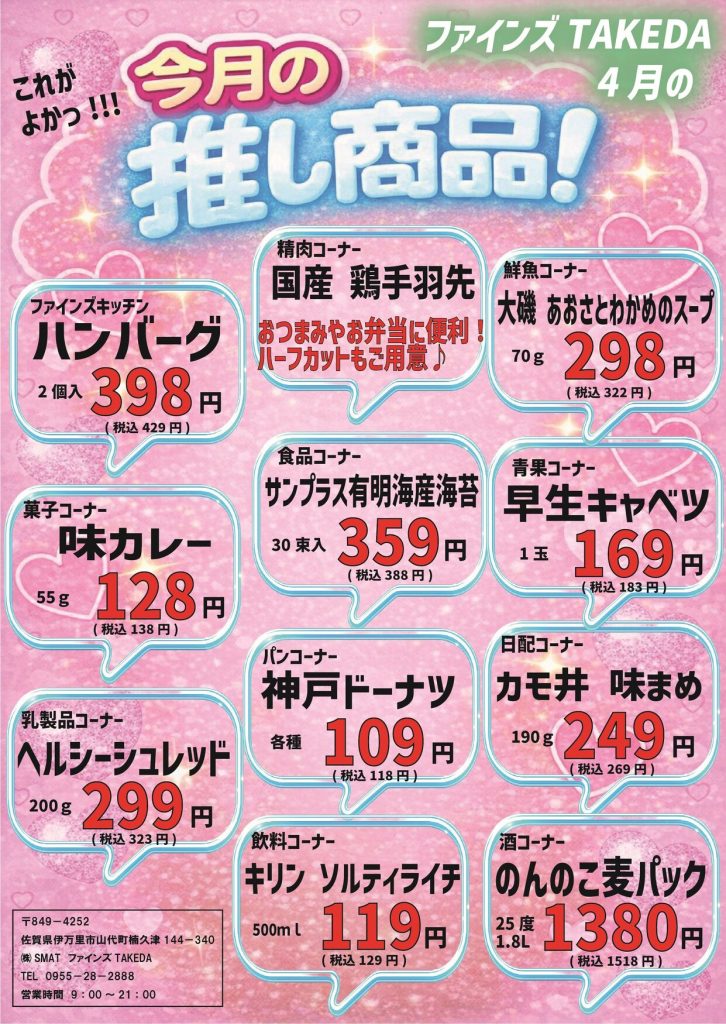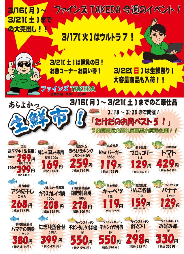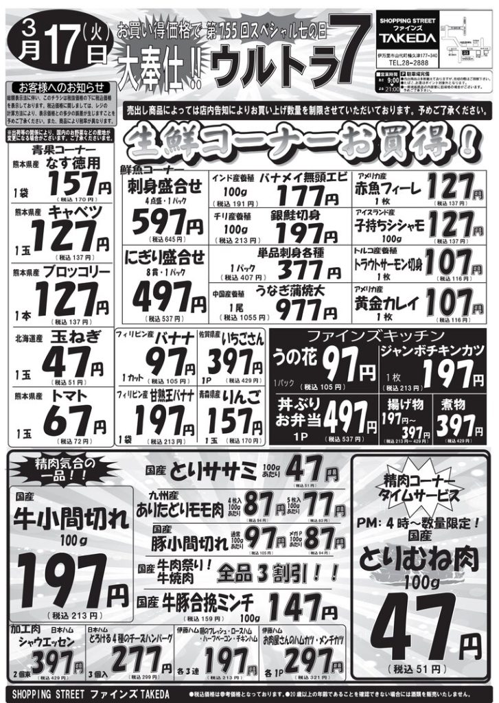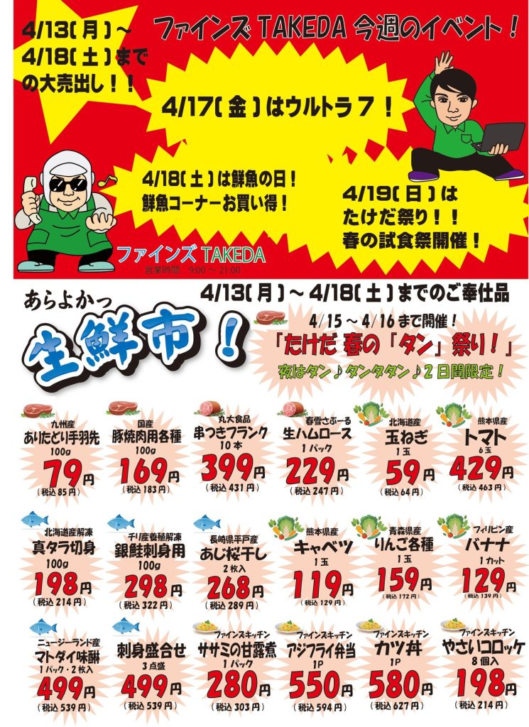 チラシ掲載No. 1サイト『トクバイ』のアプリでファインズたけだのタイムサービス情報をチェックできます!毎日日替わりのお買い得品を掲載!夕方4時からたけだに行ってお買いどくゥ〜♪