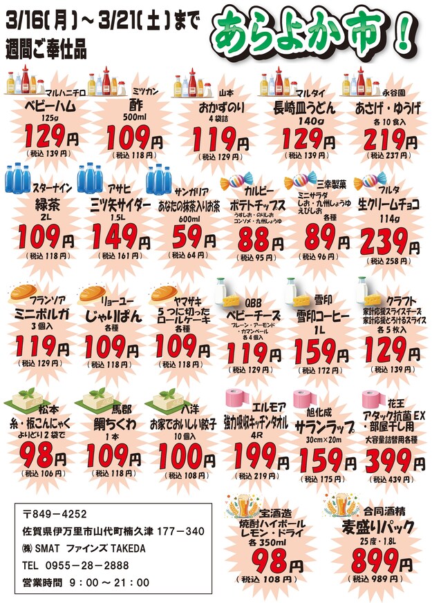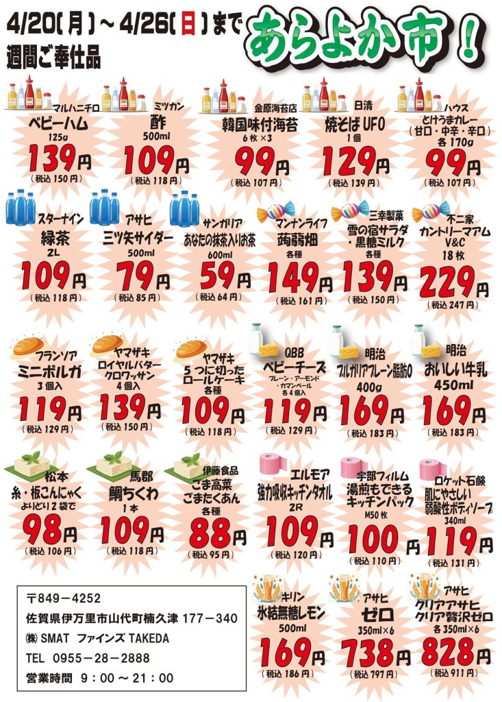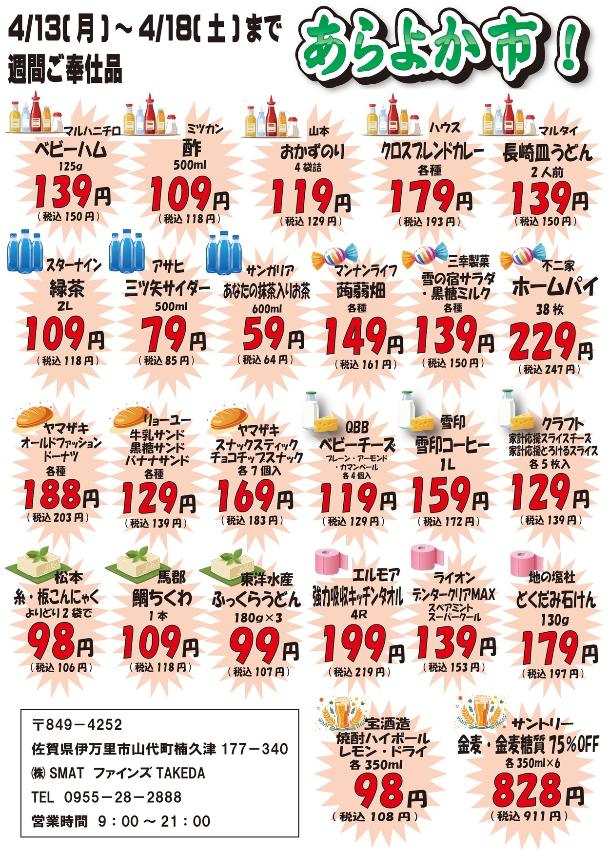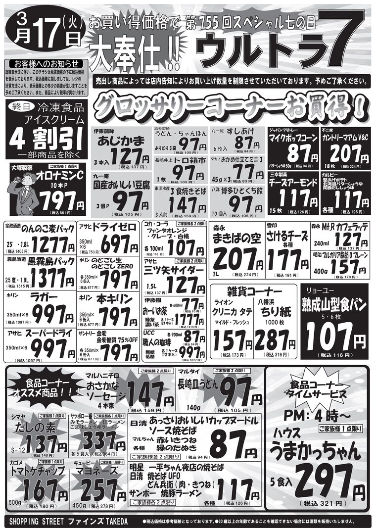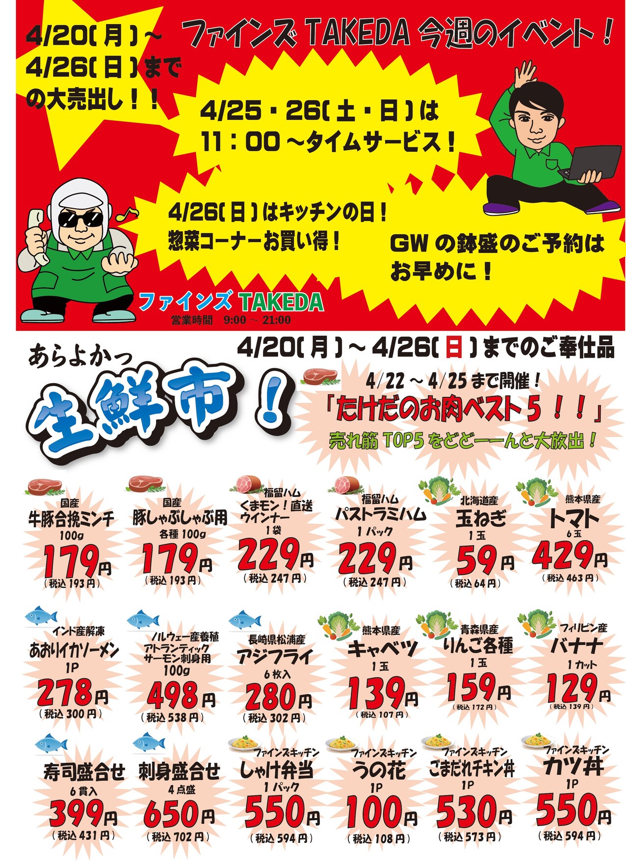 チラシ掲載No. 1サイト『トクバイ』のアプリでファインズたけだのタイムサービス情報をチェックできます!毎日日替わりのお買い得品を掲載!夕方4時からたけだに行ってお買いどくゥ〜♪